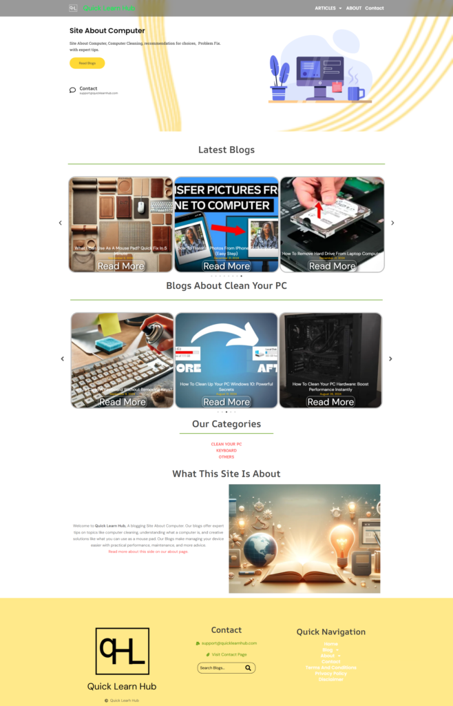 Quick Learn Hub is a blogging platform designed to provide expert tips and practical advice on various computer-related topics, including maintenance, hardware, and peripherals. Initially created as a personal blogging site, it has evolved into a collaborative platform featuring articles from multiple contributors.